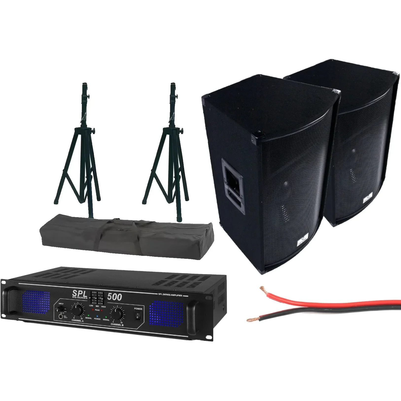 De set bestaat uit 10 inch speakers met 2 statieven om deze op te kunnen zetten, met een versterker waaraan je je laptop, telefoon of wat dan ook aan kunt aansluiten.